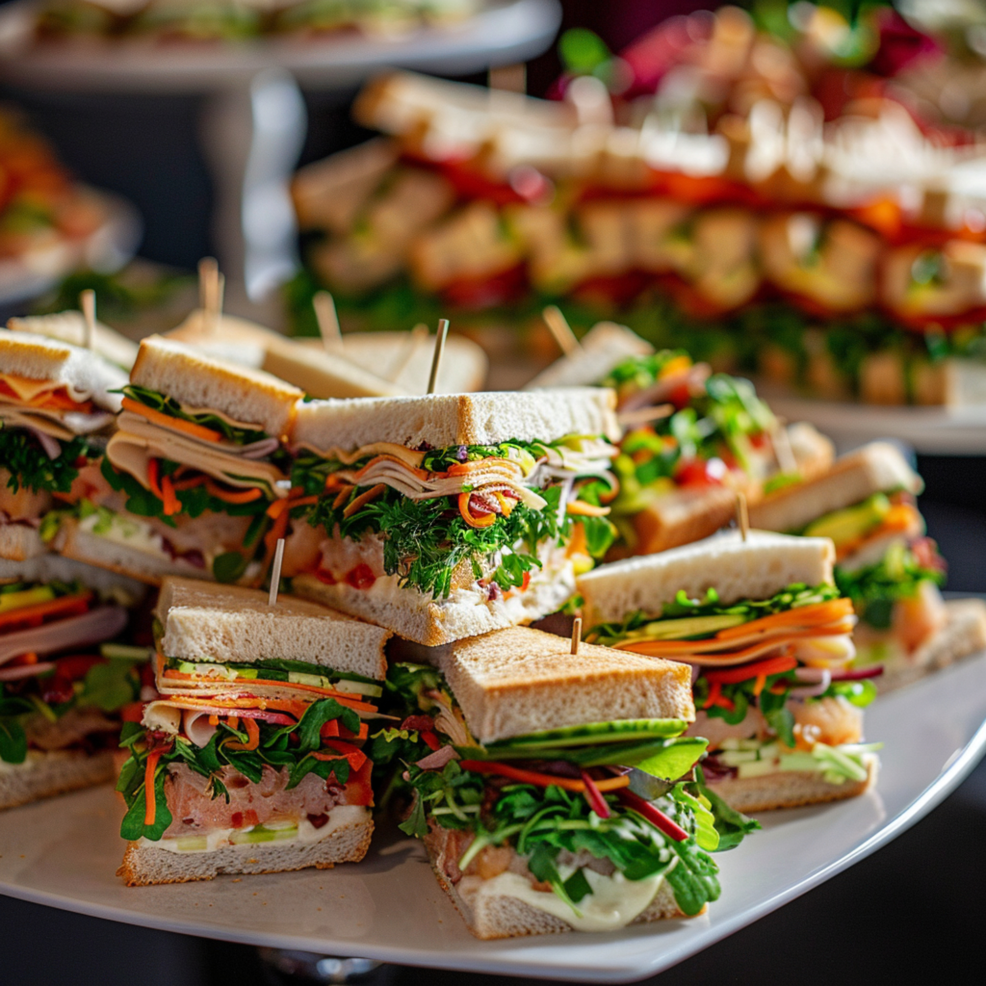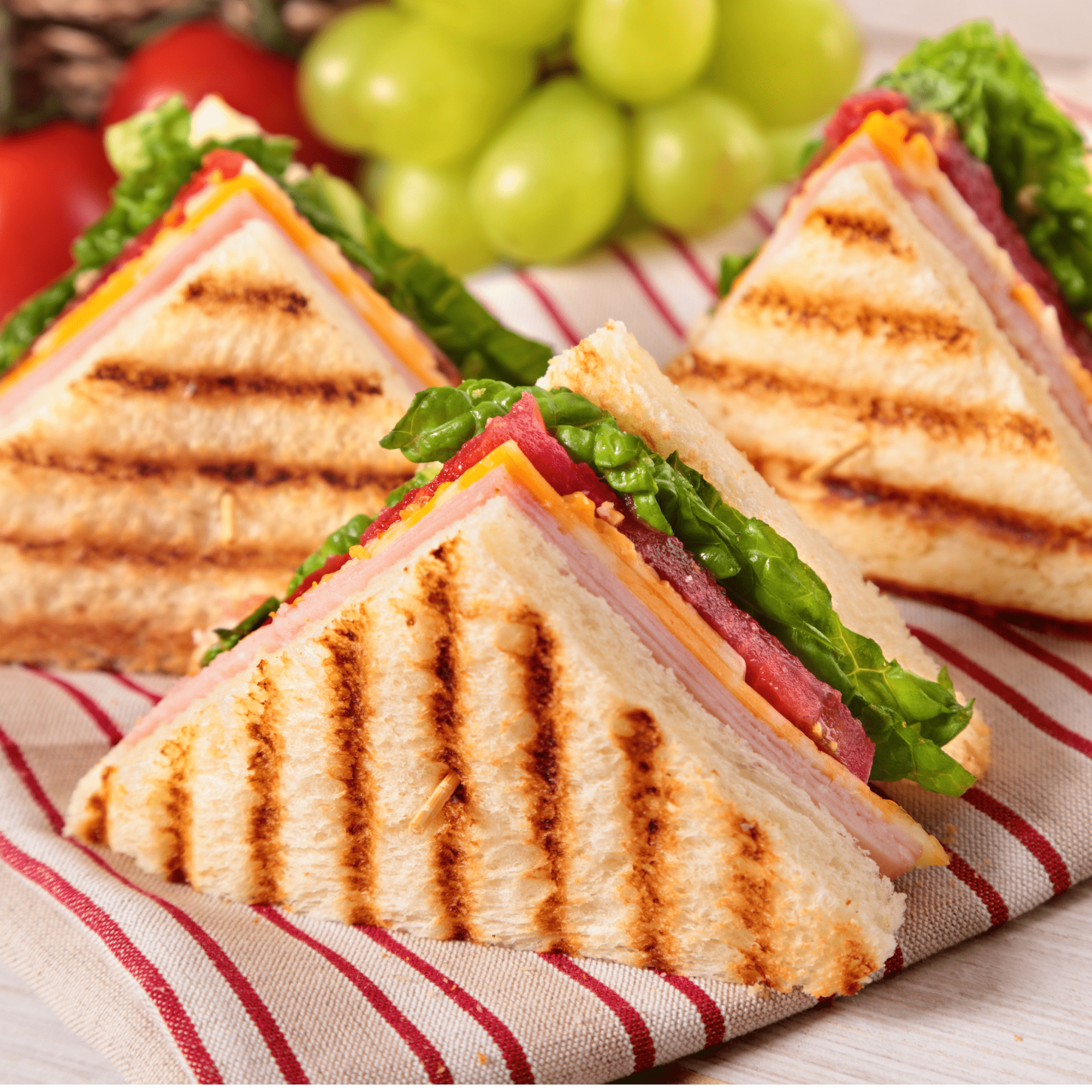 A double-decker sandwich with bacon, tomato, cheese, lettuce and either ham or turkey.